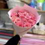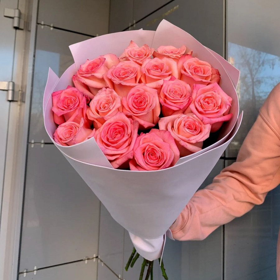 На фото букет из 15 розовых роз. В составе: роза 15 шт, крафт-бумага 1 шт, атласная лента 1 шт, . Все цветы свежие и ароматные, букет красиво оформлен и отлично подходит для подарка. Доступна доставка цветов или самовывоз.